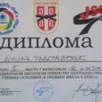 Душан Радомировић, ученик 2. разреда наше школе, такмичио се у категорији до 42 kg. Одрадио је 4 борбе и освојио 2. место за нашу школу и самим тим прву медаљу од када се званично такмичи. За школу је ово такође прва медаља, јер се до сада нисмо такмичили у овом спорту. Тиме се још више поносимо Душановим успехом.