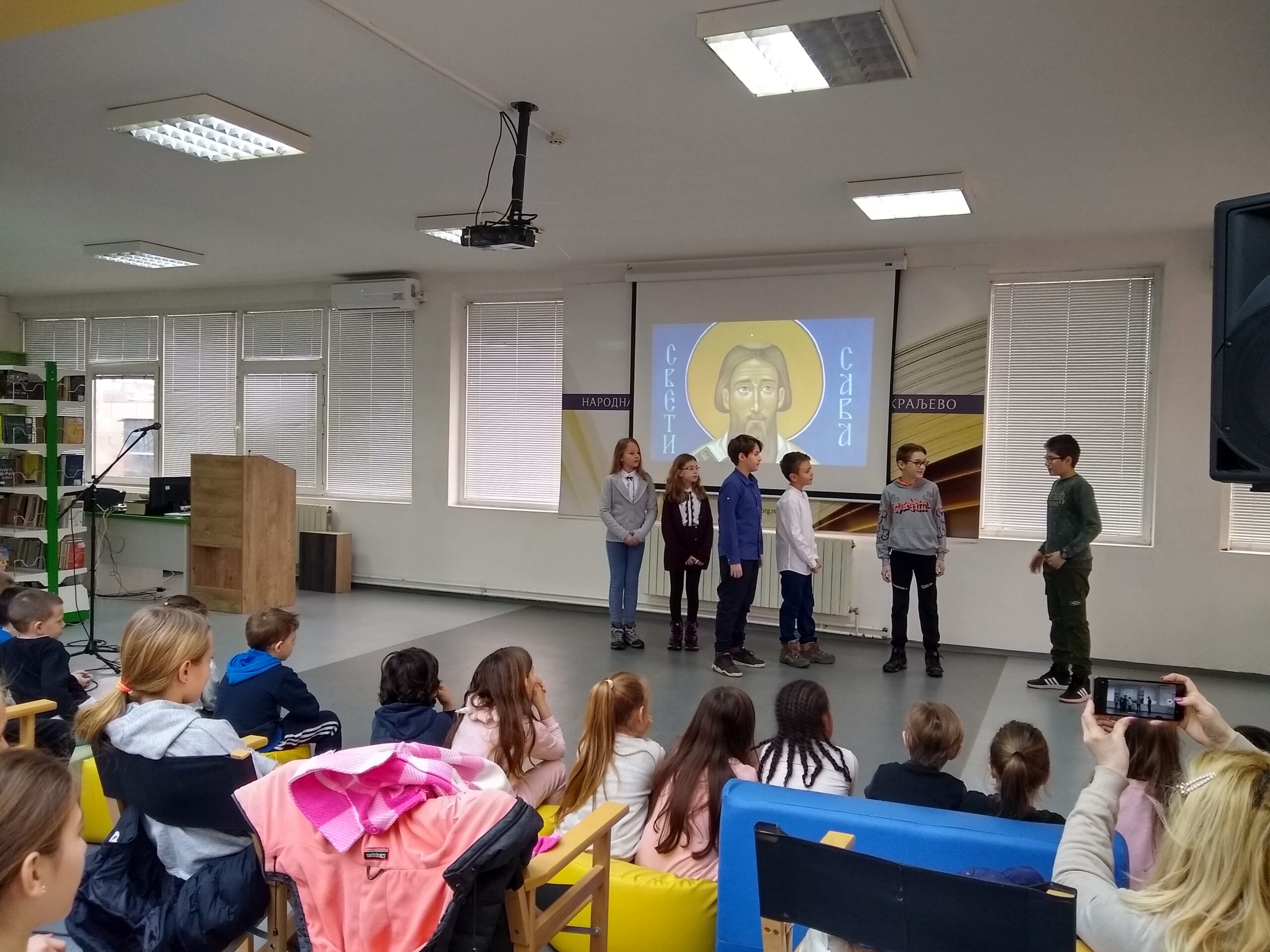 Предшколци ПГ „Чуперак“ из Краљева су употпунили програм наступом у којем су хорски одрецитовали песму о Светом Сави. Библиотека је на поклон од ових креативних малишана добила колаж цртежа и текстова о Сави, као и мозаик на којем је приказан лик првог српског просветитеља.