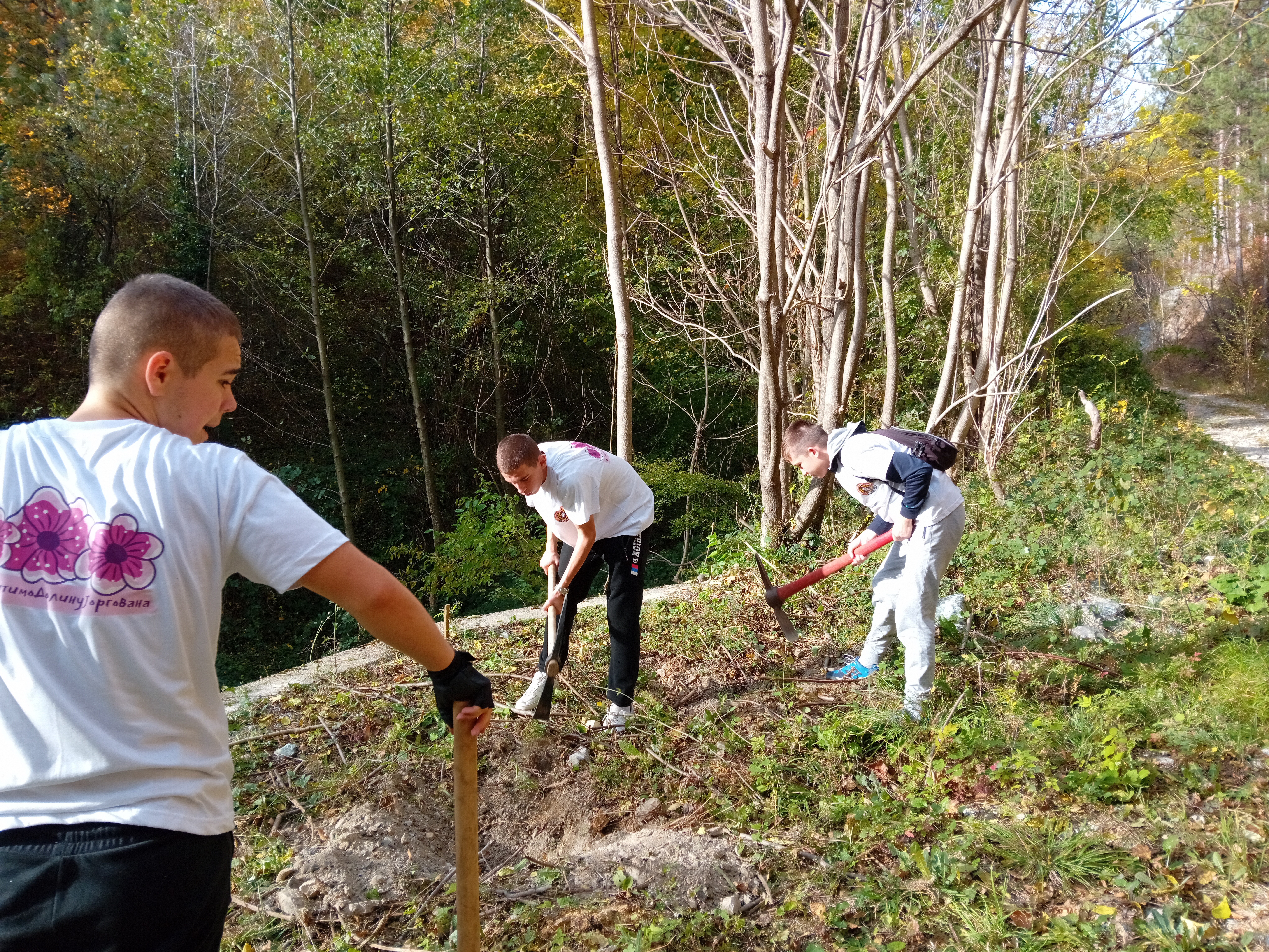 На пут према Богутовцу кренули смо у 8.00 часова и после получасовне вожње стигли смо на наше одредиште где нас је чекао домаћин Жељко. На предлог нашег домаћина одлучили смо да јорговане посадимо око извора краљице Драге и тиме допринесемо да тај кутак нетакнуте природе буде још лепши. Доброг расположења и орни за посао наши ученици узели су крампове и кренули да ископавају рупе за саднице. За то време ученице су донеле саднице до извора и одмах се придружиле мушкој екипи. Док смо ископавали рупе певали смо Ђолетову песму „Сада знам шта је права ствар, сад сам схватио како се ради, данас ћу имати страшан жуљ, ваљда најбољи у бригади“. На сву срећу жуљева није било, иако смо посадили око четрдесет садница.
